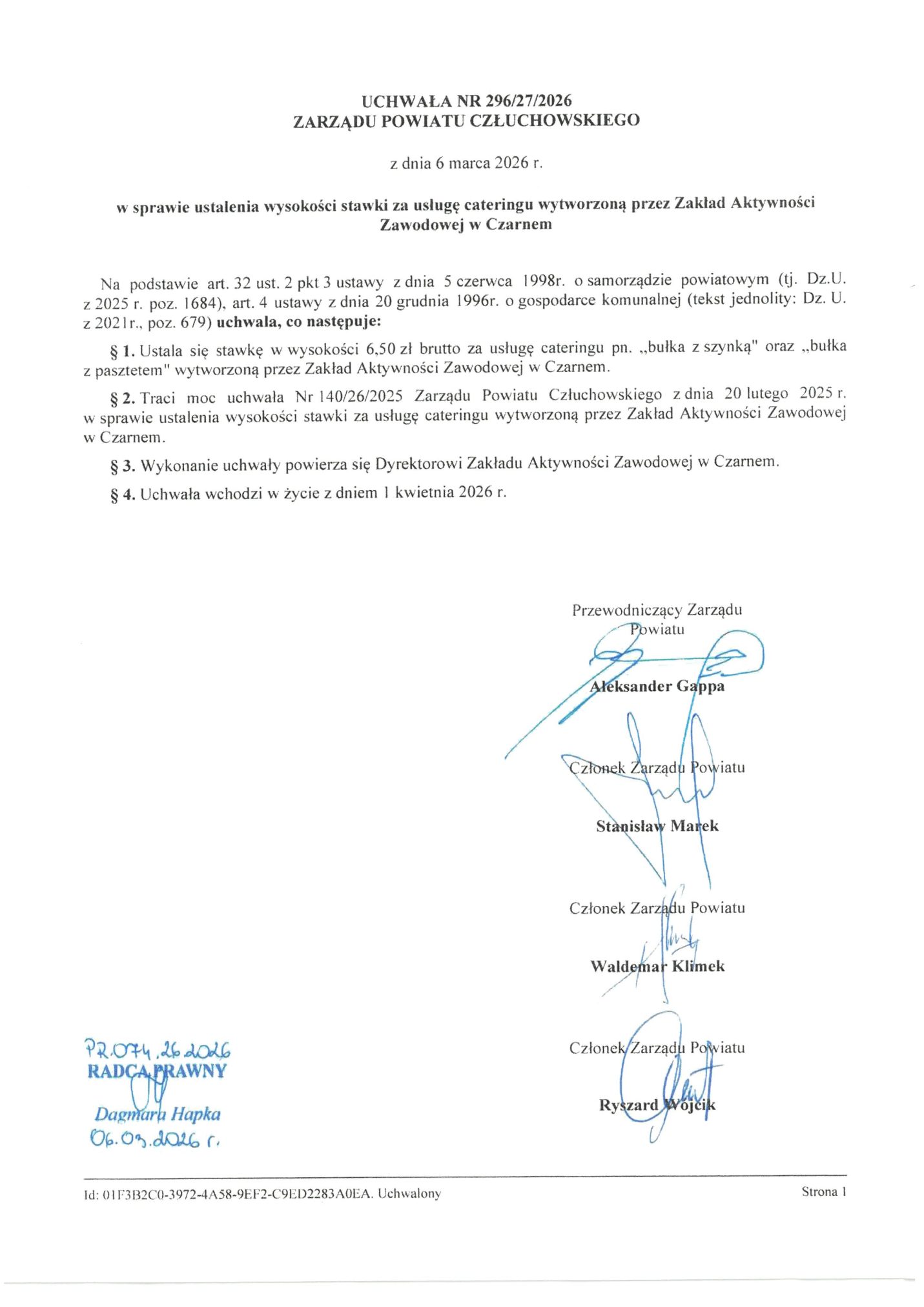 Uchwała Nr 296/27/2026 Zarządu Powiatu Człuchowskiego z dnia 6 marca 2026r. w sprawie ustalenia wysokości stawki za usługę cateringu wytworzoną przez Zakład Aktywności Zawodowej w Czarnem.